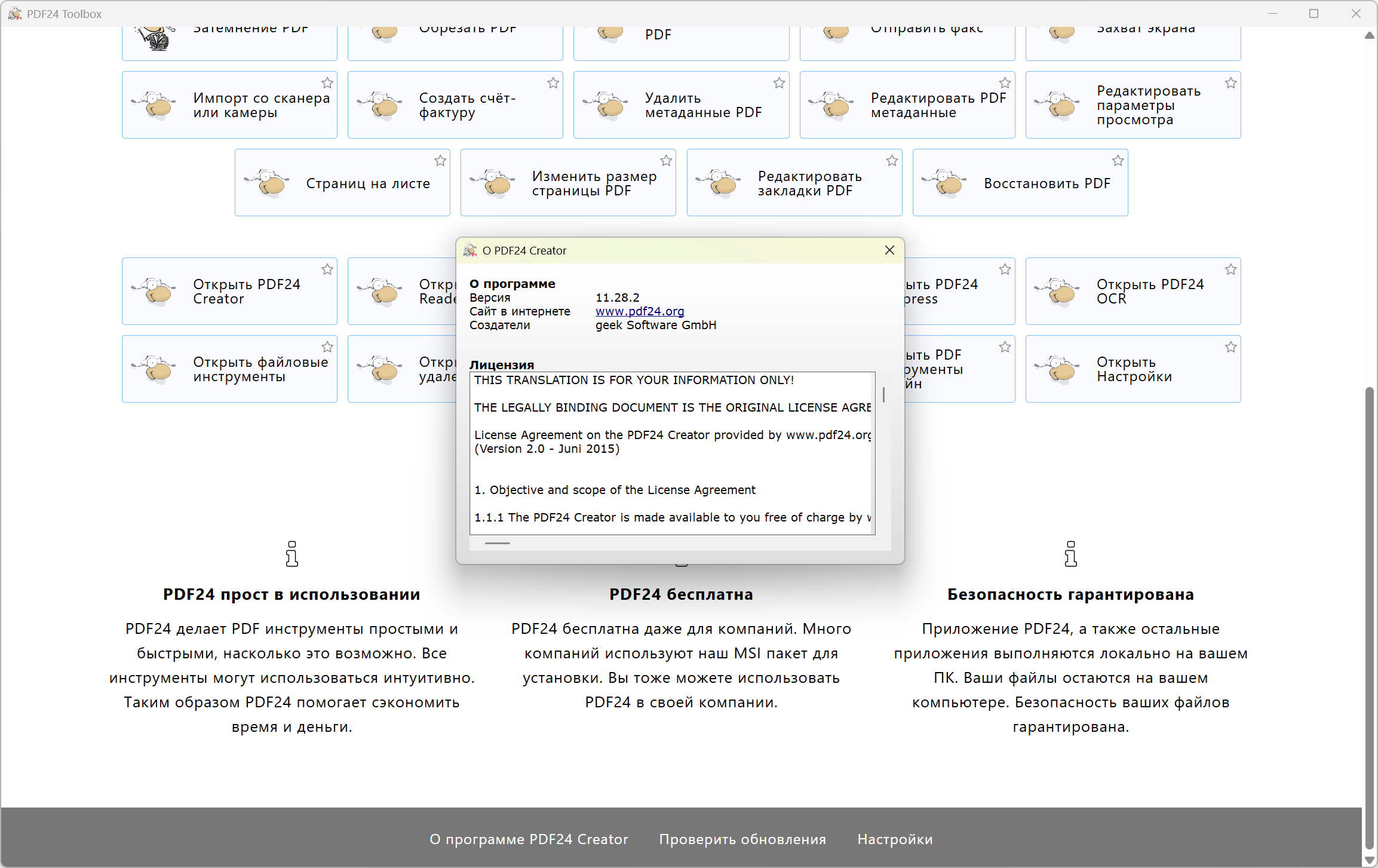 PDF24 Creator является бесплатным для как для личного пользования, так и для использования в бизнесе.